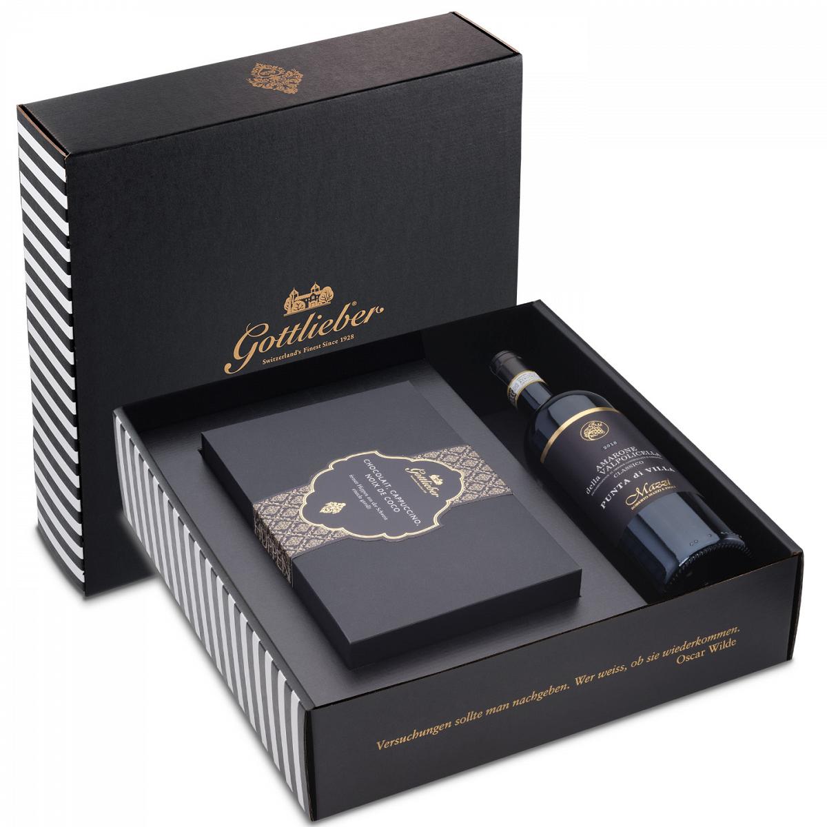 Das Gottlieber Geschenkset Grande Italia ist eine exklusive Auswahl an edlen Hüppen-Kreationen und einer Flasche Amarone della Valpolicella classico Punta di Villa DOCG. Ideal als luxuriöses Geschenk für Geniesser, präsentiert sich das Set in einer stilvollen Box mit Satinband.