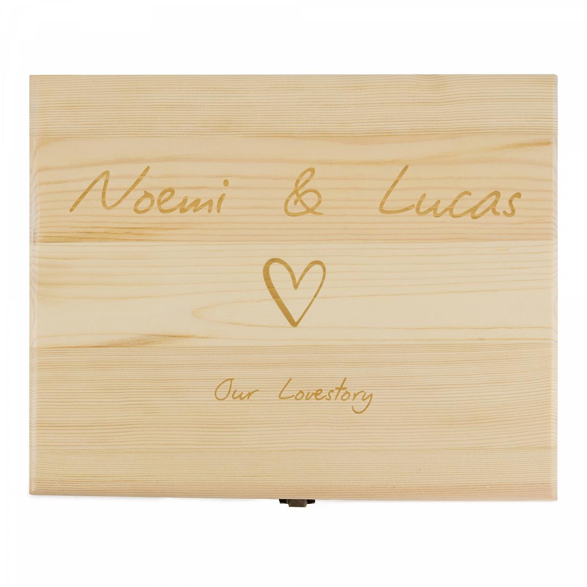Die Personalisierbare Erinnerungskiste zur Hochzeit ist eine elegante und praktische Möglichkeit, die besonderen Erinnerungen an den Hochzeitstag stilvoll aufzubewahren. Aus natürlichem Kiefernholz gefertigt, bietet sie mit 31 x 25 x 16 cm viel Platz für Fotos, Briefe oder kleine Andenken. Mit einer individuellen Gravur versehen, wird die Box zu einem einzigartigen Geschenk, das die Liebe und den besonderen Tag für immer bewahrt.