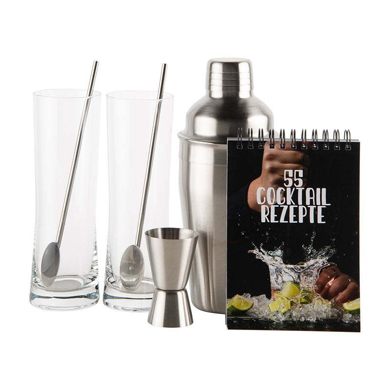 1x Shaker, 2x Longdrinkgläser, 2x Trinkhalmlöffel, 1x Barmass, 1x Rezeptblock