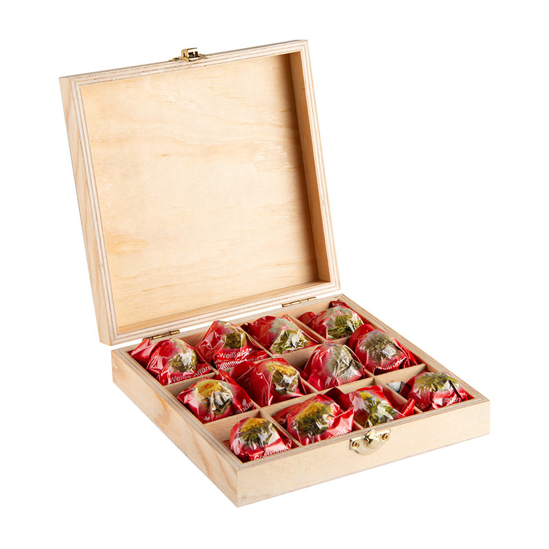 Mache den Teegenuss zu einem unvergesslichen Erlebnis. Mit den Erblühtee Geschenkboxen hast du ein schönes Geschenk für jeden Teeliebhaber. Dank der sensationellen Blüte, die aus jeder Erblühteekugel wächst, wird ein leckerer Tee auch zum Augenschmaus. Die Holzbox enthält 12 Erblühteekugeln in 6 Variationen. Mit den spektakulären Erblühtee Kugeln gewinnt der Teegenuss eine eindrucksvolle, optische Komponente dazu. In aufwändiger Handarbeit werden die Kugeln gebunden und geben erst in einem Gefäss voll kochendem Wasser ihr Geheimnis preis. übergiesst man die Erblühtee Kugeln mit heissem Wasser, blühen sie nach ca. 8 Minuten auf und verwandeln sich dabei in farbenprächtige Kunstwerke. Mit den Erblühtee Geschenkboxen hast du das perfekte Geschenk für jeden Teeliebhaber. Die faszinierenden Teekugeln ergeben nach dem Aufblühen eine perfekte Kombination aus leckerem Tee und einem wahren Augenschmaus.