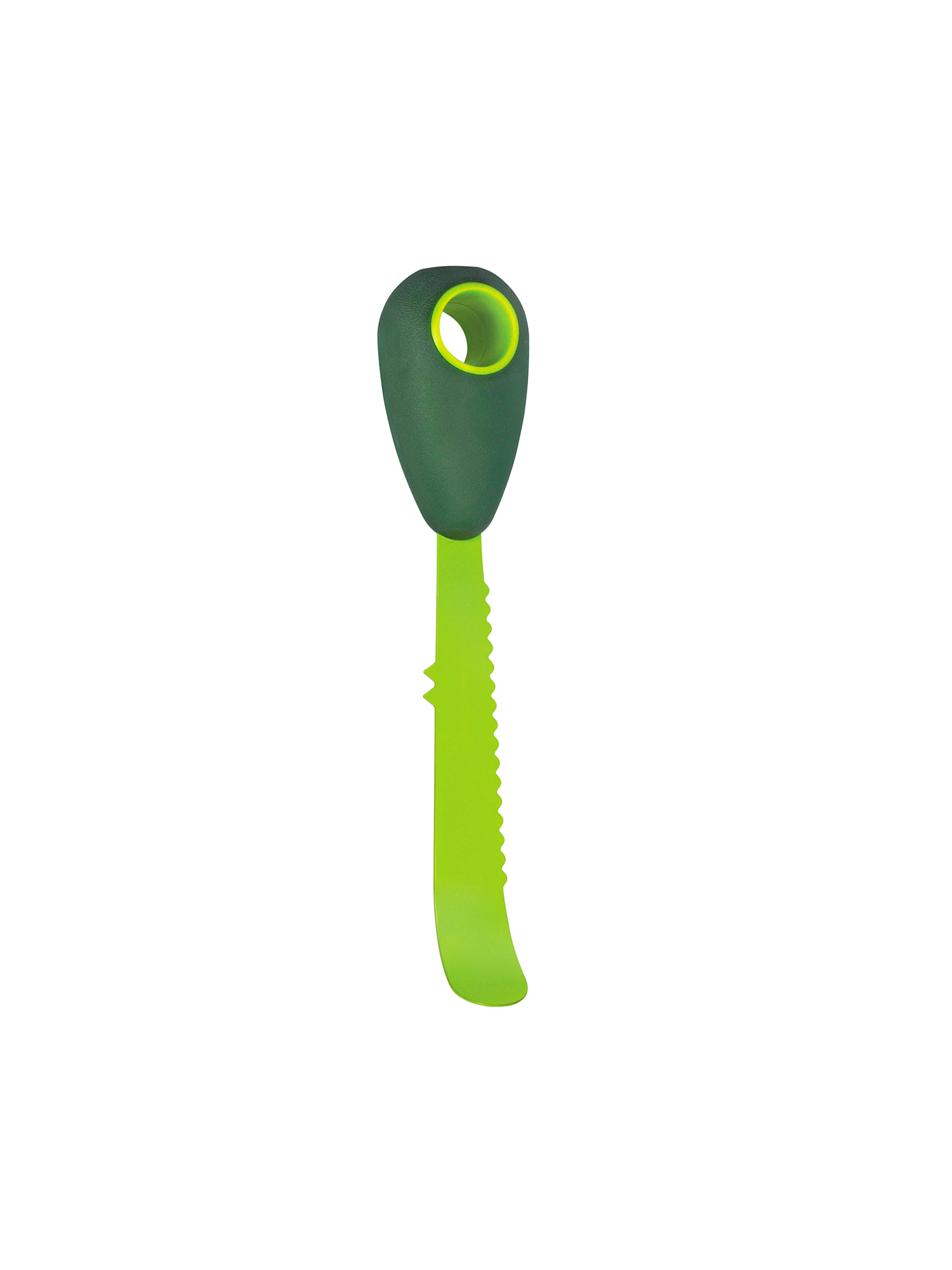 Unser Avocadomesser mit flexibler, vorgeformter Klinge und Entkerner ist die Wunderwaffe zum Öffnen, Entkernen, Häuten und Zerteilen von Avocados. Vorgeformte, flexible und antihaftbeschichtete Klinge erleichtert das Trennen von Fruchtfleisch und Haut. Entkerner zum einfachen Entfernen des Avocadokerns. Ergonomischer Griff in Form der Frucht ermöglicht angenehmes Arbeiten - Mit Loch zum Aufhängen.