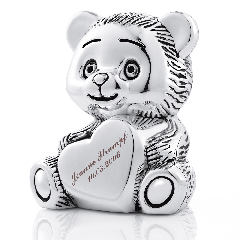 Der personalisierbare versilberte Sparbär mit Herz ist das ideale Geschenk für Ihr Baby. Denn durch eine persönliche Gravur wird dieser Sparbär mit Herz zu einem einmaligen Präsent und einer unvergesslichen Erinnerung.