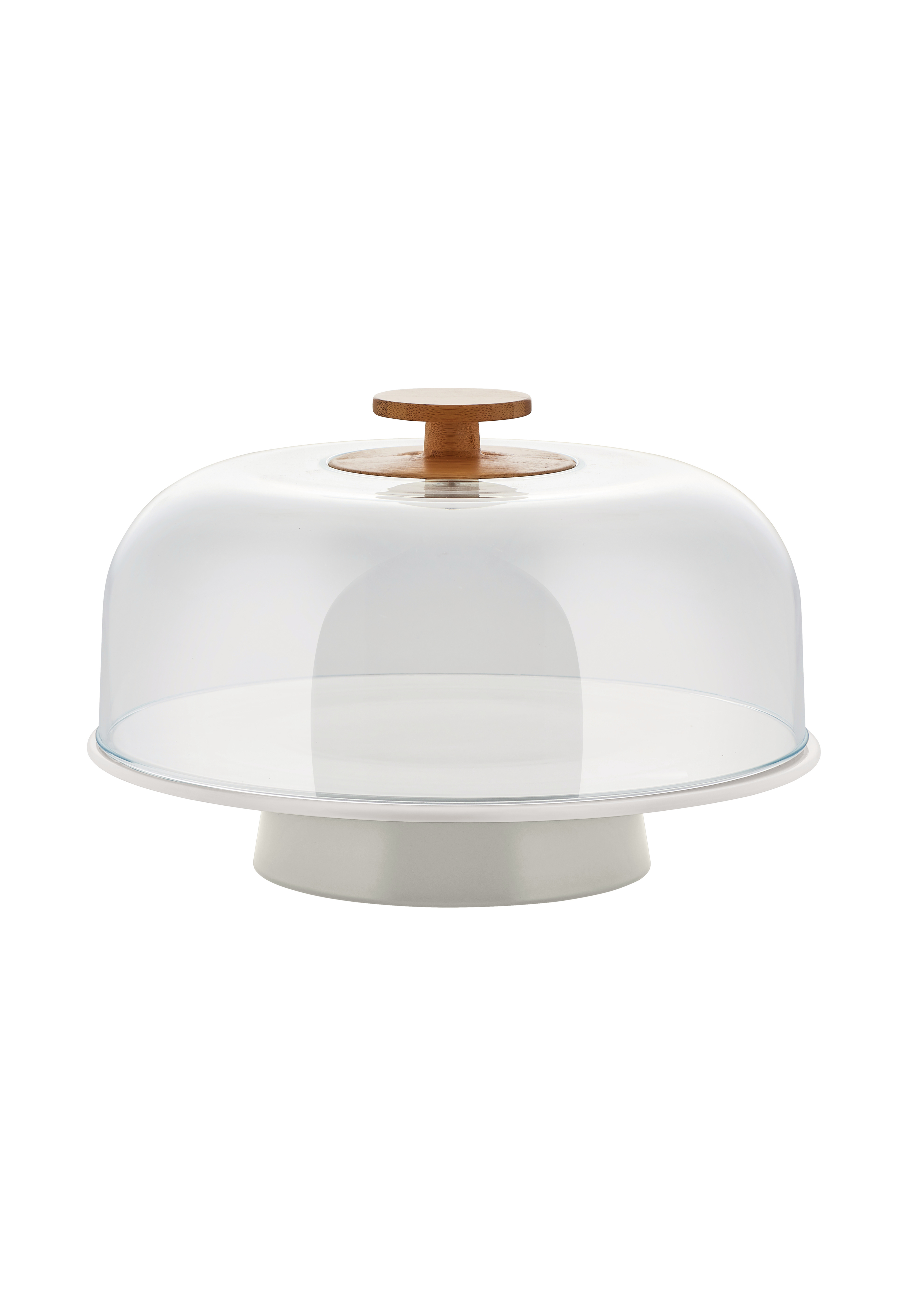 - Die Etagère besteht aus einer Glocke aus Kunststoff und einem Bambusgriff