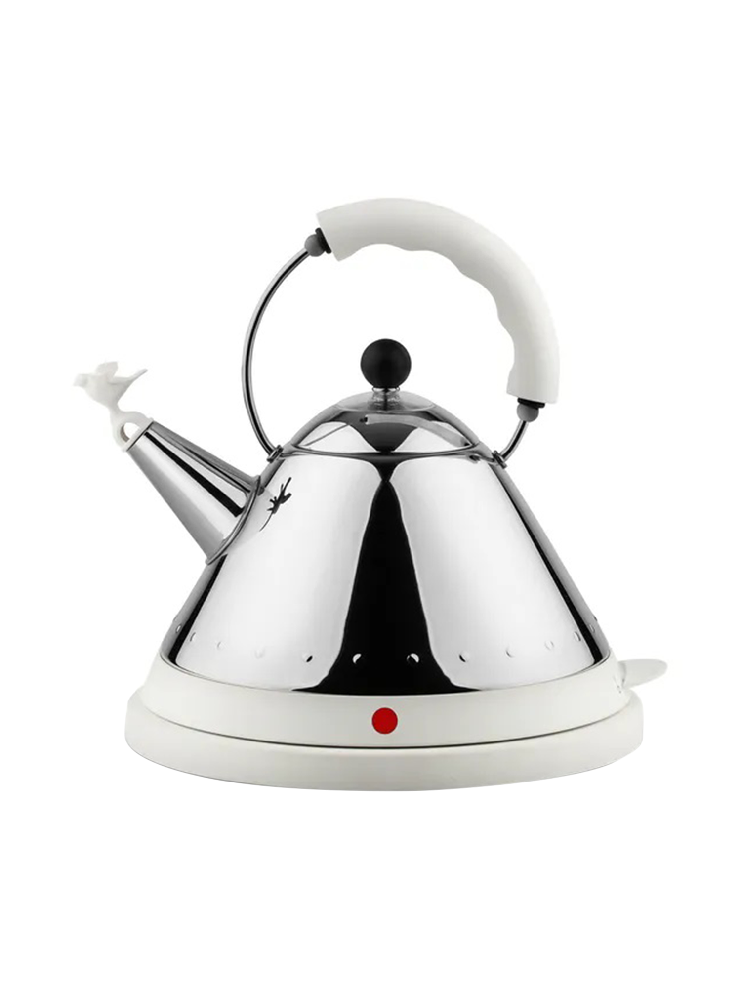 Der von Michael Graves entworfene elektrische Wasserkocher mit 1,5 Liter Fassungsvermögen ist ein beliebtes Produkt von Alessi. Hergestellt aus hochglanzpoliertem Edelstahl, verfügt der Wasserkocher über einen praktischen Griff und eine kleine vogelförmige Pfeife aus Kunststoff. Der magnetische Stahlboden ermöglicht die Verwendung auf normalen sowie Induktionskochfeldern.