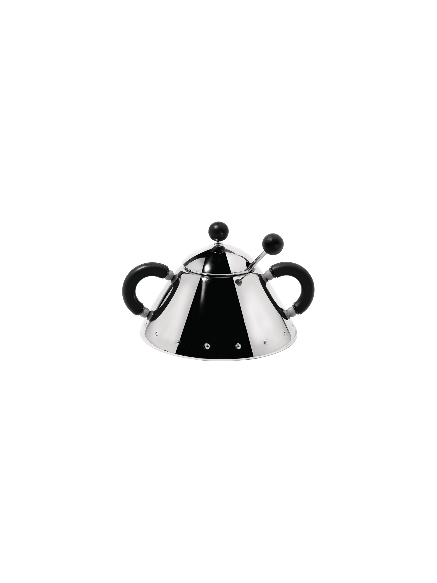 Zuckerdose mit Löffel. Verspielt wie sein berühmter Wasserkocher 9093 aus dem Hause Alessi, entwirft Michael Graves in der reizvollen Kegelform Behälter für Milch und Zucker.