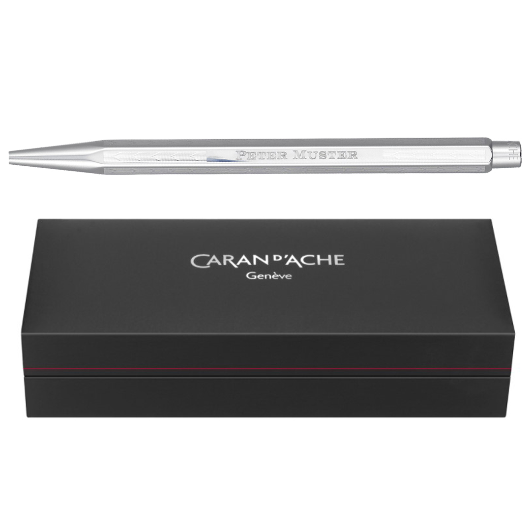 Mit der von Ihnen gewünschten Lasergravur wird der Personalisierbarer Chevron Caran d'Ache Ecridor Stylo versilbert zu einem ganz speziellen Kugelschreiber. Bitte beachten Sie bei der Eingabe des Namens, dass Sie keine Sonderzeichen eingeben. Es sind maximal 20 Zeichen zugelassen. Die Bereiche aus Metall wurden beim Personalisierbaren Chevron Caran d'Ache Ecridor Stylo rhodiniert und versilbert. Somit verspricht Ihnen dieser edle Kugelschreiber ein langlebiges Schreibvergnügen! Egal ob an einem speziellen Anlass, während der Freizeit oder eines Meetings: Mit dem Personalisierbaren Chevron Caran d'Ache Ecridor Stylo hinterlassen Sie überall und jederzeit einen beträchtlichen Eindruck. Die Caran d'Ache Die 1924 in Genf gegründete Firma Caran d'Ache ist der in der Schweiz verbleibende einzige Hersteller von Bleistiften, Produkten zum Malen und Zeichnen sowie Schreibgeräten. Das Unternehmen lebt in der Tradition eines Landes, das für die Herstellung von Uhren und Schmuck berühmt ist. Kein Wunder also, dass es weltweit einen ausgezeichneten Ruf für Produkte von aussergewöhnlicher Qualität und Schönheit geniesst. Dazu gehören auch luxuriöse Schreibgeräte und Accessoires sowie Produkte für den Bürobedarf.