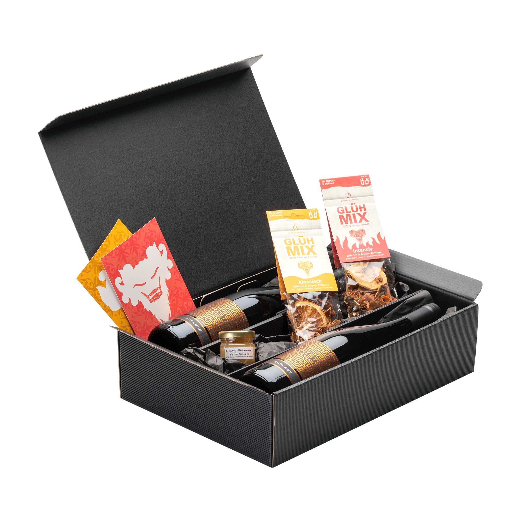 Entdecke die exklusive Swiss Collection – eine kleine, feine Genuss-Box voller Schweizer Spezialitäten! Du erhältst hochwertigen Schweizer Honig vom Bözberg, zwei edle Flaschen "Auslese" Rotwein aus dem Schaffhauser Weinberg sowie unsere beliebten GLÜHMIX-Sorten klassisch und intensiv, jeweils mit passenden Rezeptkarten. Die Kombination aus regionalen Köstlichkeiten und aromatischen Glühmischungen macht diese Box zum perfekten Geschenk für alle, die das Besondere aus der Schweiz lieben. Mit dem individuell dosierbaren Gewürzbeutel wird die Zubereitung deines selbstgemachten Glühweins zum Kinderspiel – pur, einfach und fair.