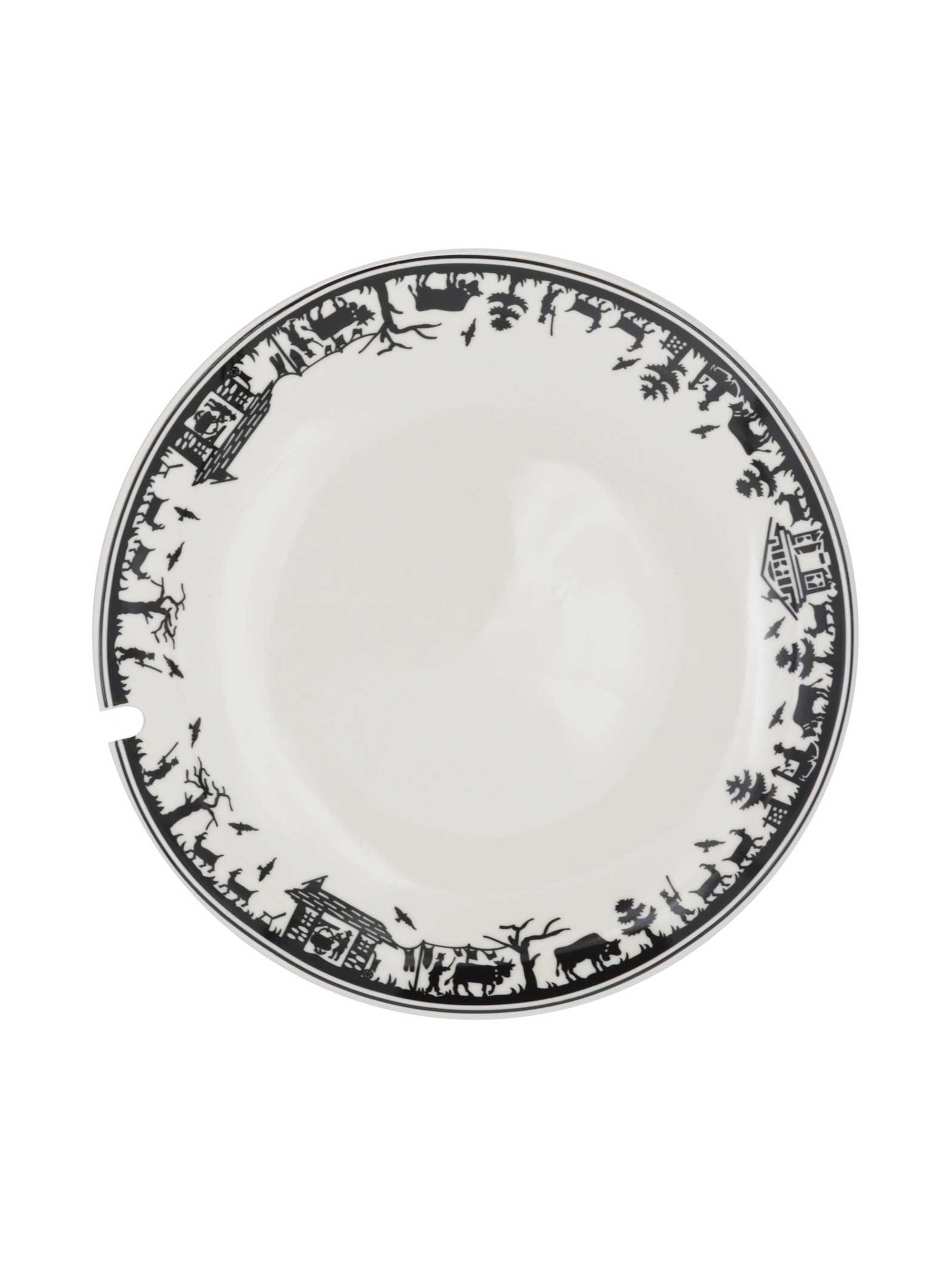 - Die gedruckten Figuren, die eine Szene des traditionellen Schweizer Poya darstellen, gehen um den Teller herum und sind auf weissem Hintergrund.