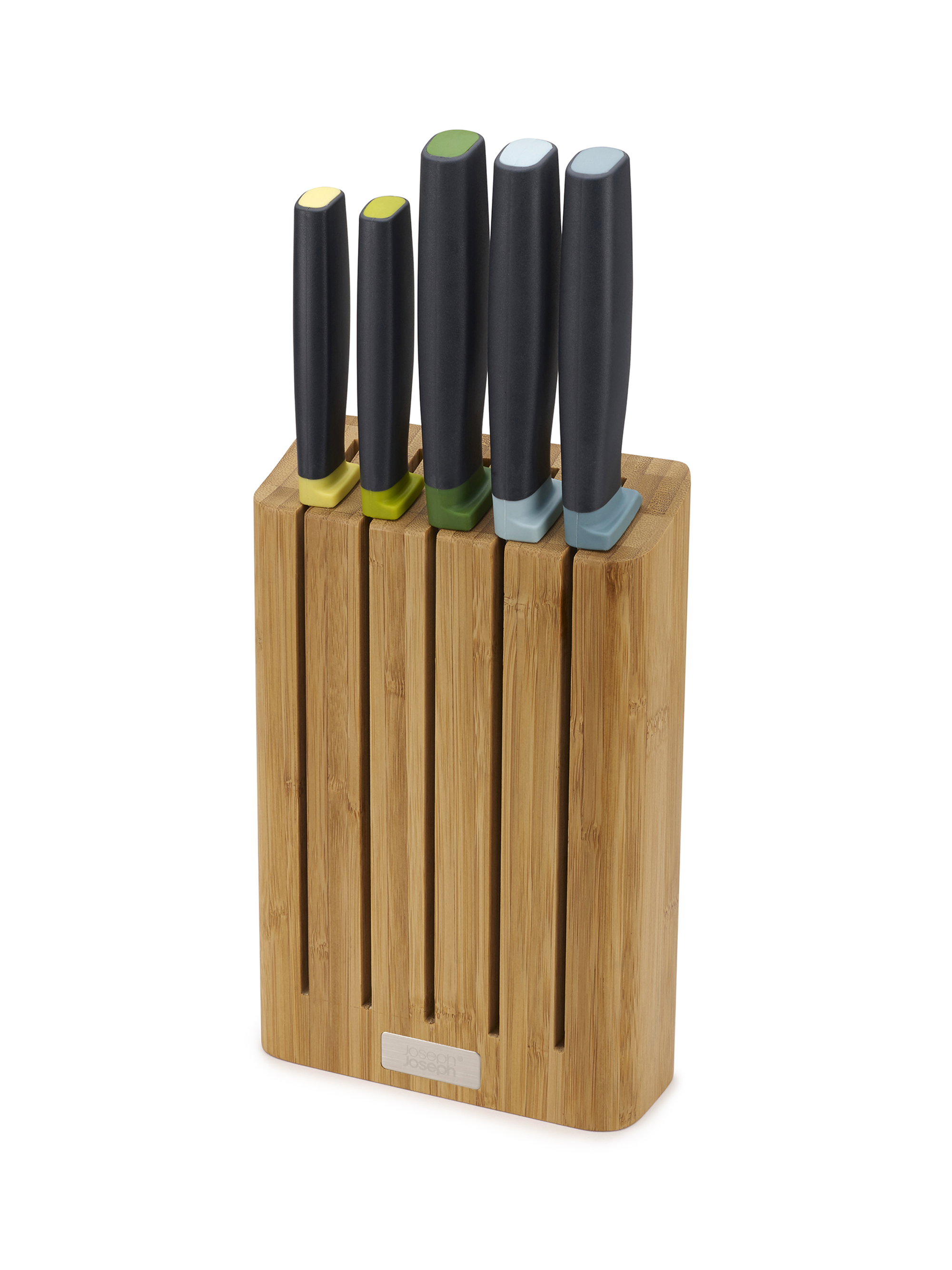 Das Messer-Set aus der Produktreihe Elevate von Joseph Joseph besteht aus 5 Küchenmessern und einem Messerblock aus robustem Bambusholz. Elevate Messerklingen sind aus hochwertigem japanischem Edelstahl gefertigt. Ein silikonumhüllter, beschwerter und ergonomischer Griff mit einer integrierten Ablagestütze verhindert, dass die Klinge beim Ablegen die Arbeitsfläche berührt. Der schlanke Bambusblock zur Aufbewahrung der Messer nimmt weniger Platz ein, als ein gewöhnlicher Messerblock. Magnetische Messerschlitze halten die Messer sicher an Ort und Stelle. Das Set beinhaltet ein 3½” Schälmesser, ein 5” Santoku-Messer, ein 6” Kochmesser, ein 8” Tranchiermesser und ein 8” Brotmesser.