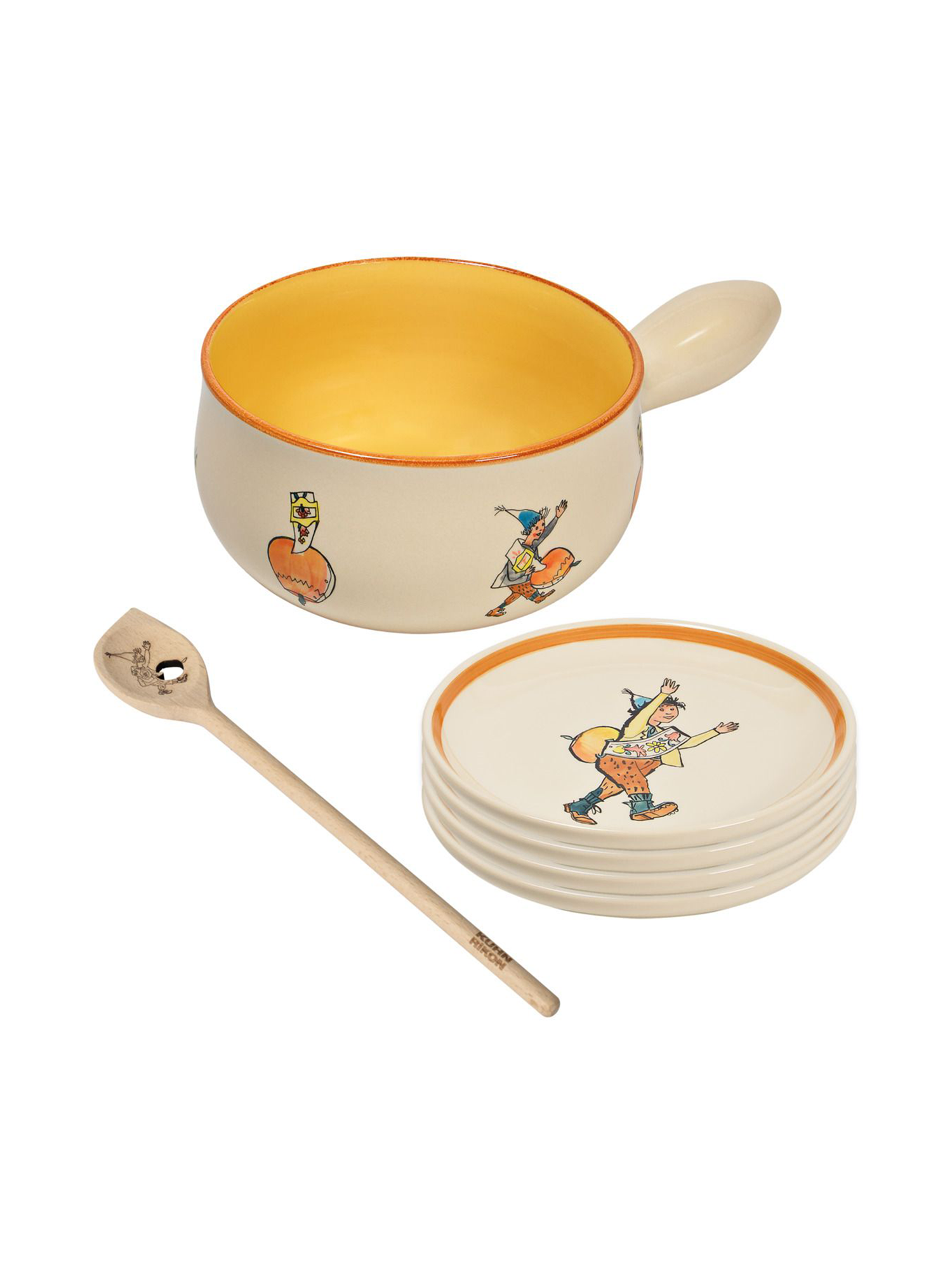 Das Fondueset besteht aus: 1 Caquelon Ursli 20cm, 4 Teller, 1 Holzkelle Ursli