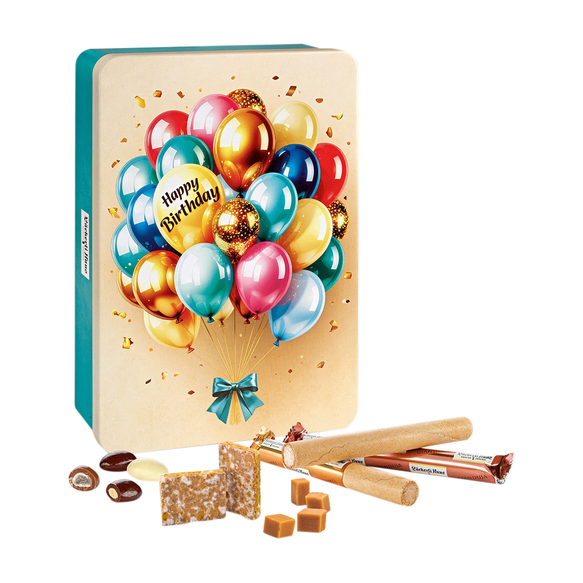 , verziert mit glänzenden Ballons und Konfetti – perfekt, um Freude zu verschenken. Ob für grosse oder kleine Geburtstagsgäste, diese prall gefüllte Blechdose steckt voller feiner Basler Spezialitäten. Ein genussvoller Höhepunkt für jede Feier und ein Geschenk, das garantiert begeistert.