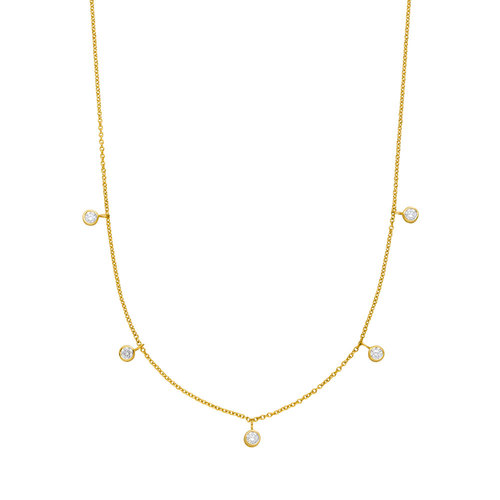 Diese filigrane Halskette aus 14 Karat Gelbgold präsentiert fünf zart eingefasste Diamanten, die an feinen Ösen entlang der Kette befestigt sind. Die beweglichen Diamantanhänger verleihen dem Schmuckstück eine verspielte Leichtigkeit und sorgen für funkelnde Akzente bei jeder Bewegung. Das zeitlose Design macht die Kette zu einem vielseitigen Begleiter für den Alltag und besondere Anlässe.