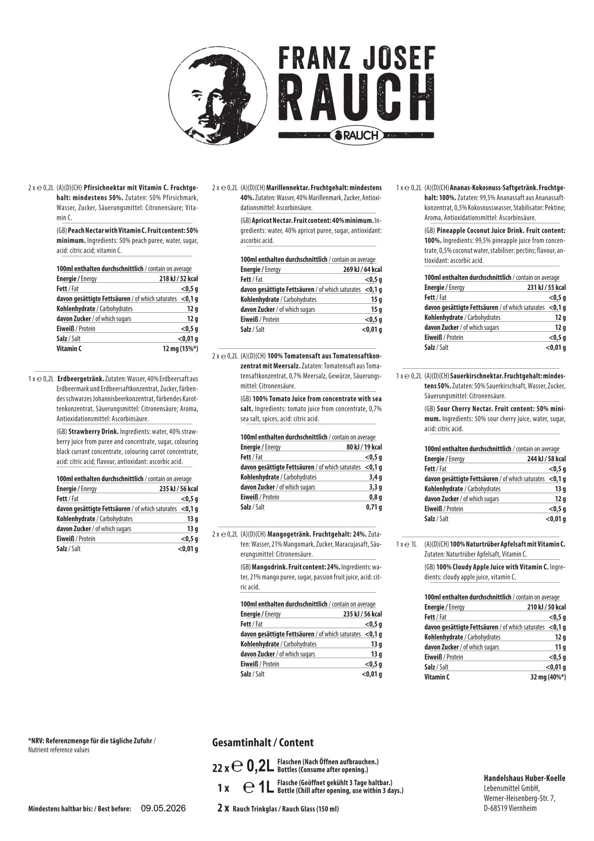 - enthält 22 Fruchtsäfte bzw. Nektare à 0.2 L , eine Flasche à 1 L und ein Rausch Glas