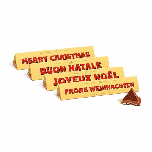 Die unverwechselbare TOBLERONE in der klassischen beigen Verpackung ist eine Kombination aus feinster Milchschokolade mit Honig-Mandel-Nougat. Im schönen Weihnachts-Design und in vier verschiedenen Sprachen, wird das süsse Geschenk garantiert deine oder deinen Liebste*n zum Strahlen bringen. Die Aufschrift ist übrigens auf eine zusätzliche Extra-Verpackung gedruckt, welche man als schönes Andenken behalten kann. Nur exklusiv bei geschenkidee.ch - ein unverwechselbarer Genuss mit jedem Zacken!