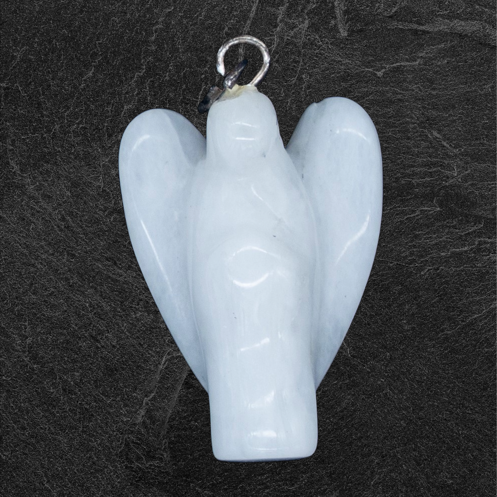 - Handlicher Engel-Anhänger aus zartem Schneequarz mit kompakten Massen von 21 x 14 x 8 mm.