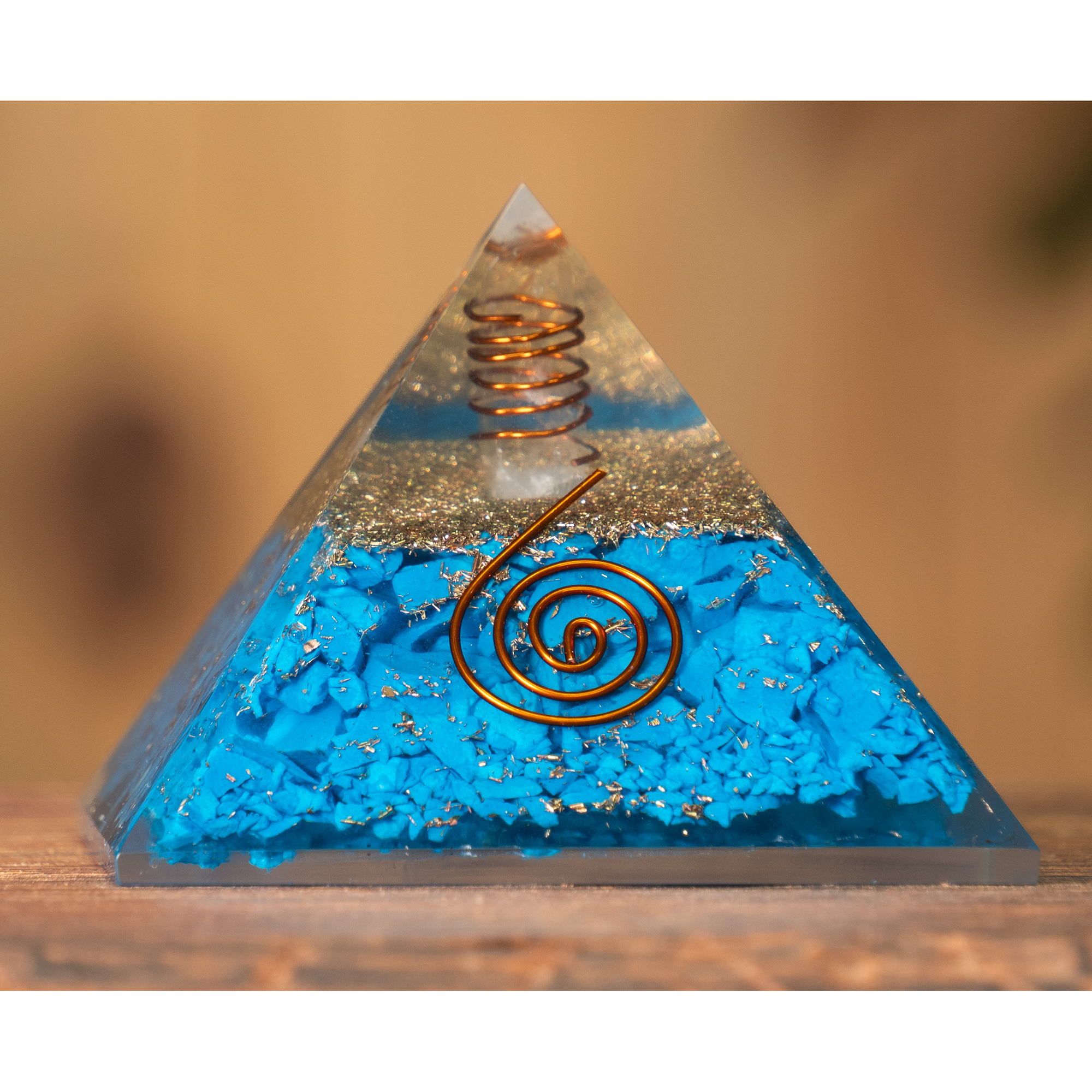 - Orgon-Pyramide mit türkis gefärbtem Quarz und Bergkristall für mehr Wohlbefinden.