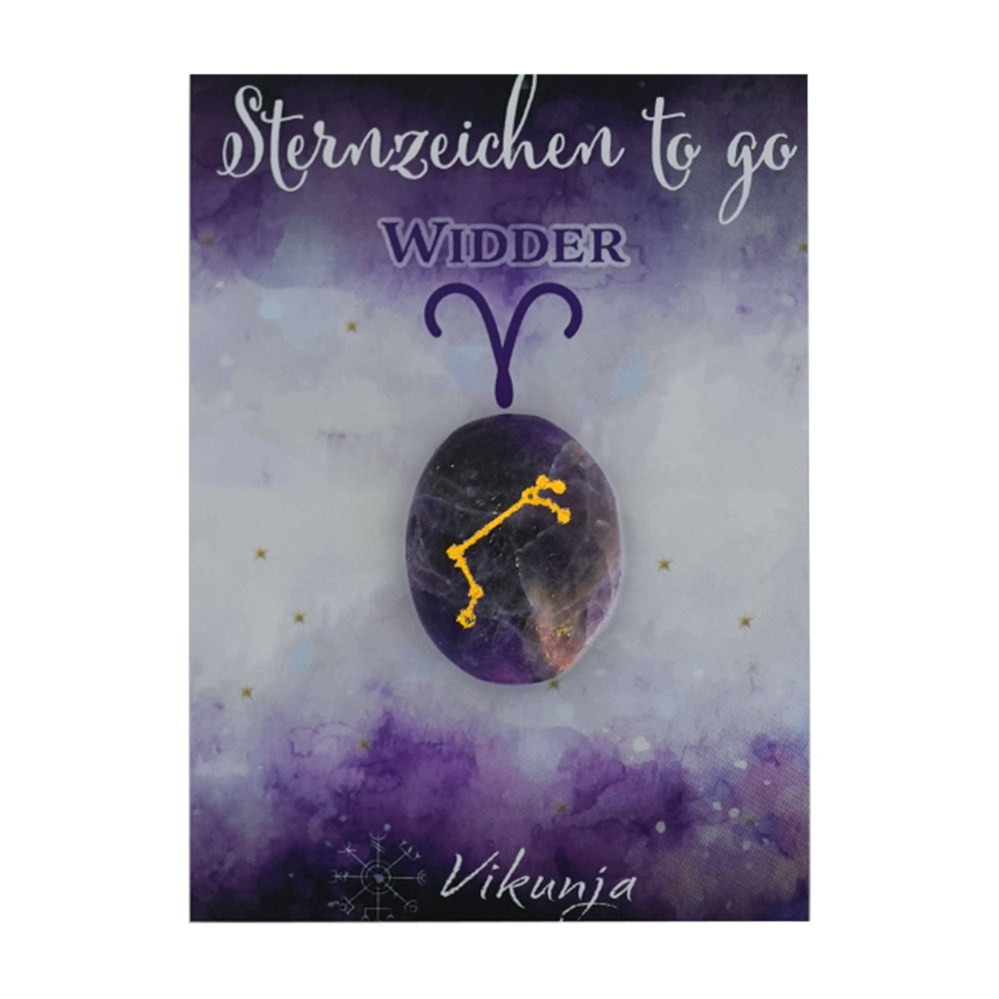 - Dein persönlicher Glücksstein aus Amethyst mit goldener Gravur der Sternkonstellation Widder.