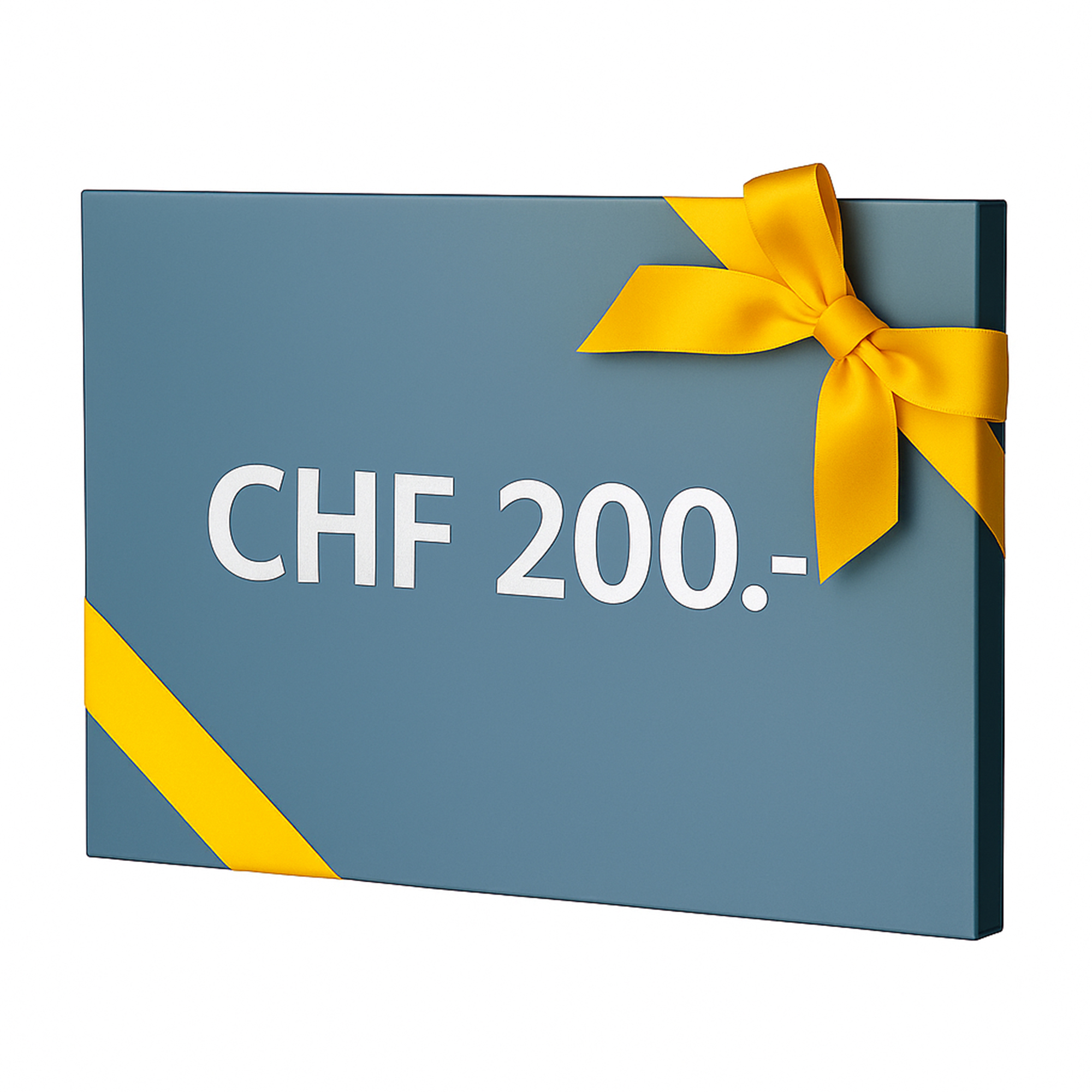 Ein Wertgutschein im Umfang von CHF 200.– für Geschenkidee.ch, einlösbar ab 24.12.2025. Er bietet die freie Wahl aus einem umfangreichen Sortiment an kreativen, personalisierbaren und originellen Geschenkideen.