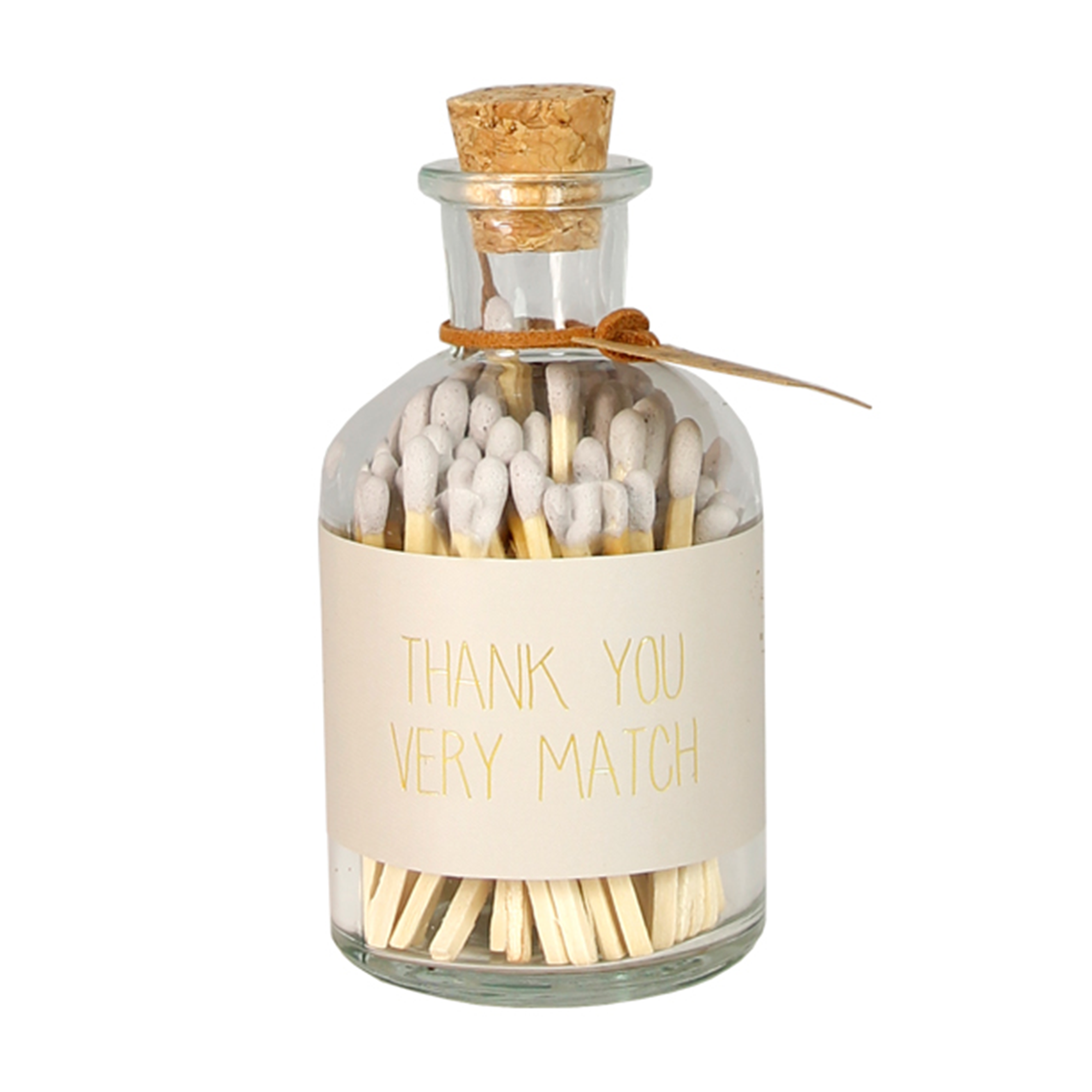 Mit den bunten Zündhölzchen in der stilvollen Glasflasche „Thank you very match“ setzt du ein farbenfrohes und nachhaltiges Highlight. Die Flasche enthält 80 farbige Streichhölzer, die perfekt zu deinen Kerzen und Dekorationen passen. Auf der Flasche findest du den liebevollen Schriftzug „Thank you very match“. Das Streichfeld befindet sich auf der Unterseite der Flasche, sodass du die Zündhölzer bequem und sicher anzünden kannst.